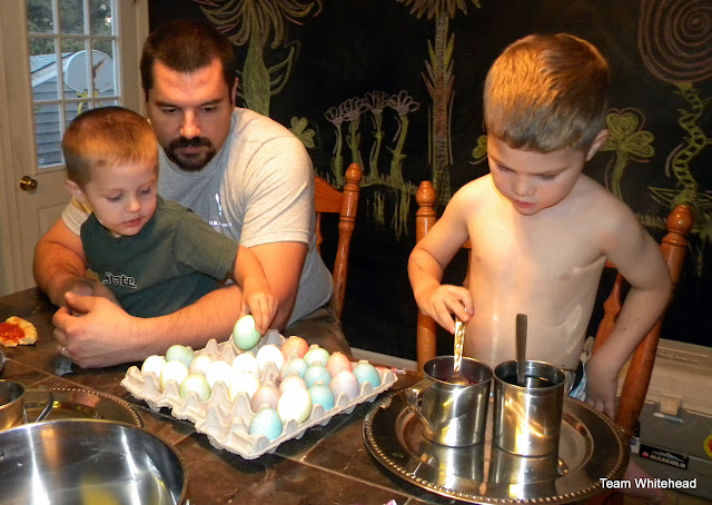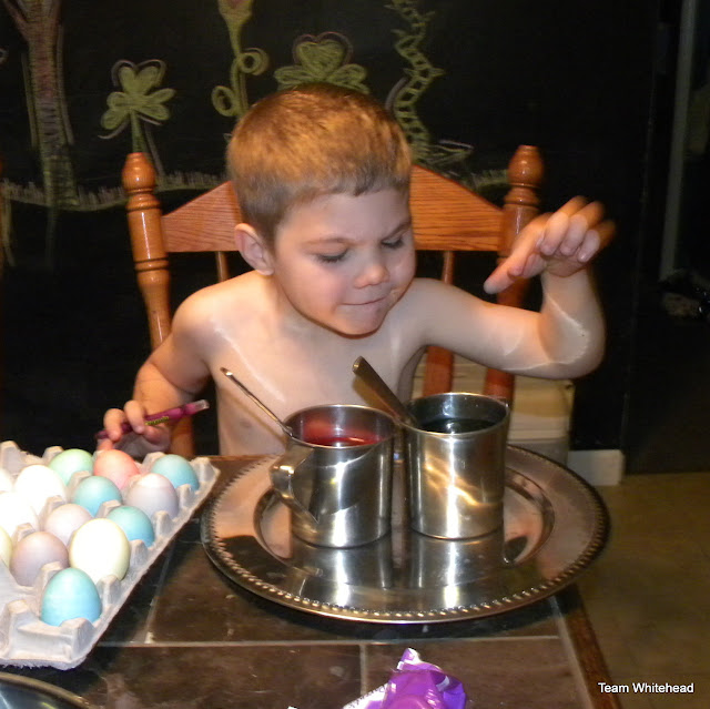 We colored eggs at home, I had some big plans to use natural dyes like berries and teas... and then when it came down to it- we just used food coloring and vinegar! Maybe next year!